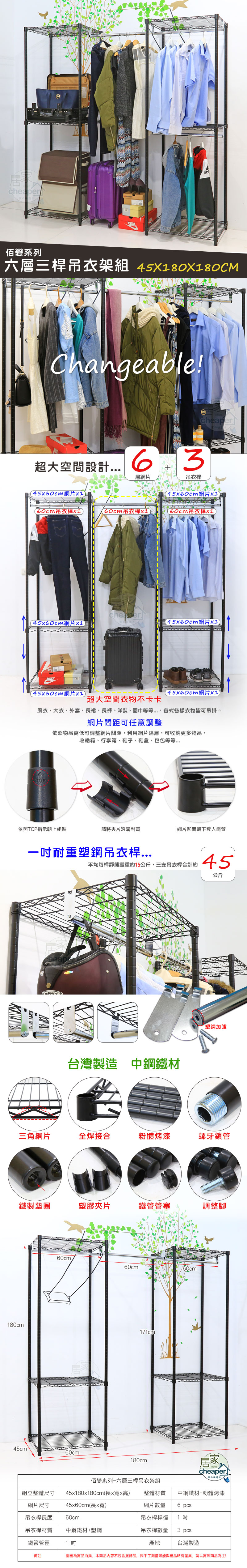 【品樂生活】佰變系列烤漆黑六層三桿吊衣架組 45X180X180CM 大衣櫥 波浪衣櫥 鐵架衣櫥