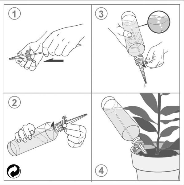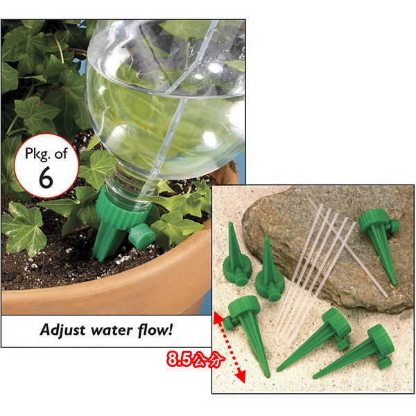 使用方法: 將塑膠吸管插入自動澆水器中,將瓶口朝下並調整出水量