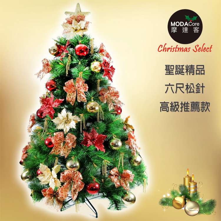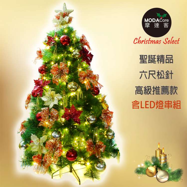 摩達客耶誕-台灣製7尺(210cm)特級綠松針葉聖誕樹+高級聖誕花蝴蝶結系配件+100燈LED燈暖白光2串(附控制器)豪華組 飯店級(本島免運費)
