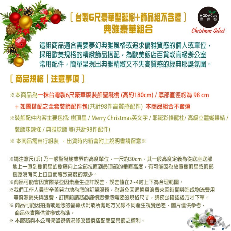 摩達客耶誕-台灣製6尺(180cm)豪華版綠聖誕樹+白五彩蝴蝶結系飾品組(不含燈)本島免運費