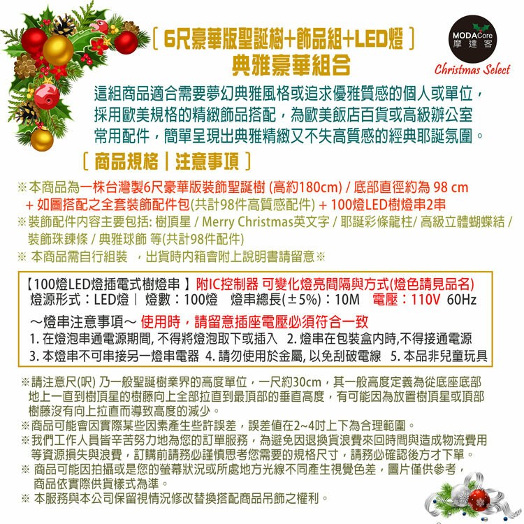 摩達客耶誕-台灣製6呎/6尺(180cm)豪華版氣質霧金系聖誕樹(金色系配件組)+100燈LED燈暖白光2串(附IC控制器)本島免運費