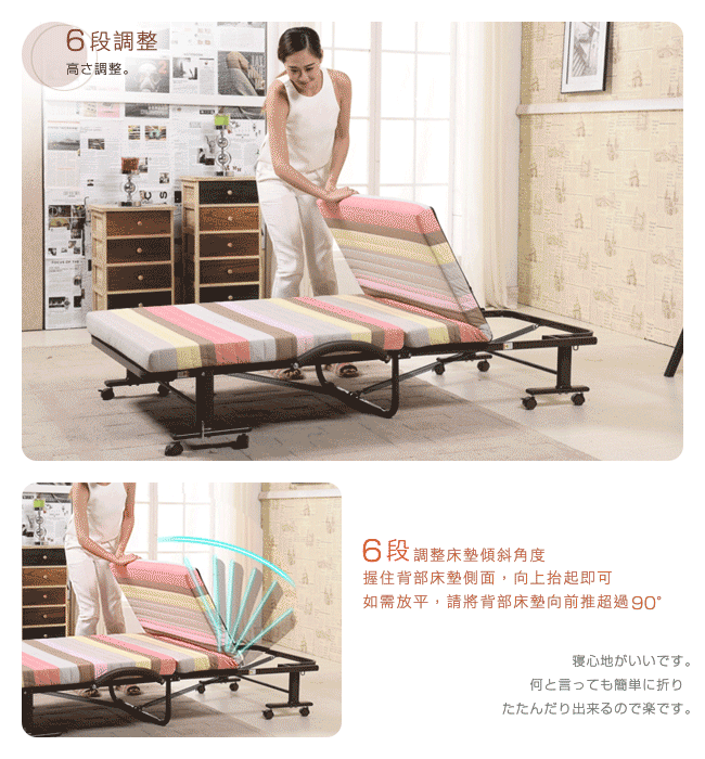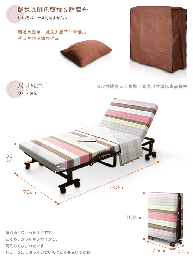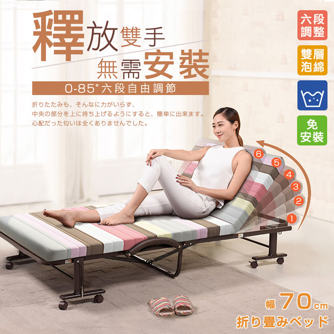 6段可調靠背角度,0~85度自由調整,腰背輕鬆減壓。床面寬幅70cm,專為小空間所設計。折疊後寬幅27cm,移動輕鬆,不佔地方,可收納於牆邊角落。可拆洗拉鍊式床套,清潔容易,保持居家的乾淨氛圍。雙層泡綿床墊設計,舒適與耐用兩者兼備。床墊加厚7cm,帶來良好的睡眠品質。安全插銷與防夾手設計,在折疊與展開床面時,操作過程更加的安全,防止不慎夾傷。高耐荷重床鋼架、加密鋼網、加厚鍍鋅管,承重力強,經久耐用。貼心贈送咖啡色頭枕,小憩愜意;防塵套避免灰塵沾染,保持床面整潔。
