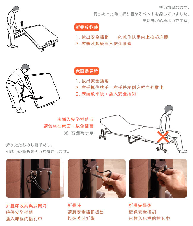 床折疊的時候:折疊時請將插銷拔出,以免將其折彎。