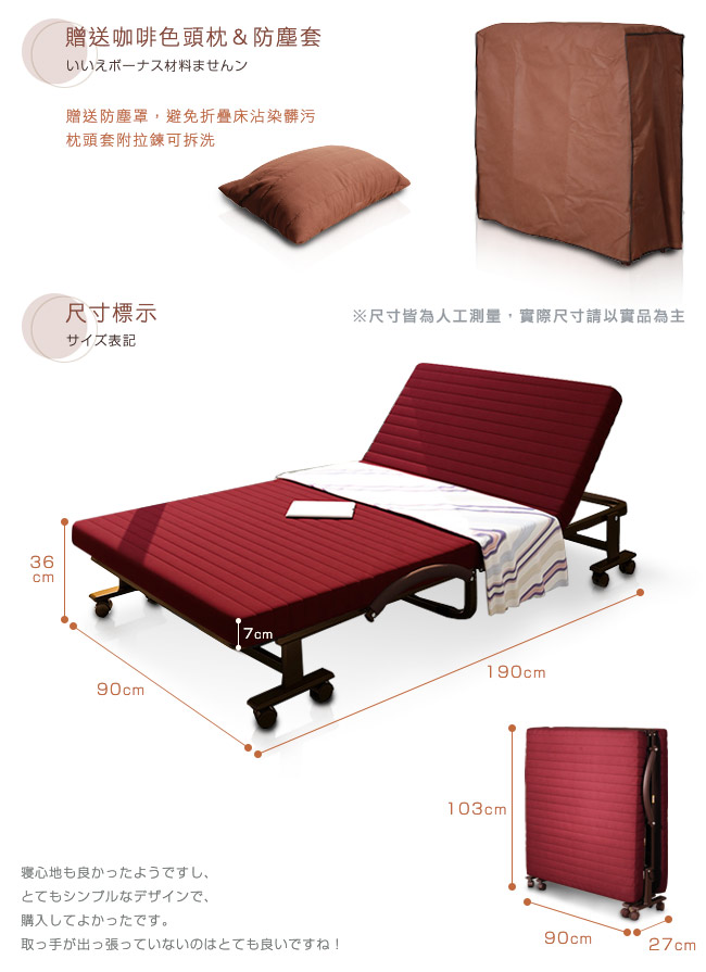6段可調靠背角度,0~85度自由調整,腰背輕鬆減壓。折疊後寬幅27cm,移動輕鬆,不佔空間,可收納於牆邊角落。可拆洗拉鍊式床套,清潔容易,保持居家的乾淨氛圍。雙層泡綿床墊設計,舒適與耐用兩者兼備。床墊加厚7cm,帶來良好的睡眠品質。安全插銷與防夾手設計,在折疊與展開床面時,操作過程更加的安全,防止不慎夾傷。高耐荷重床鋼架、加密鋼網、加厚鍍鋅管,承重力強,經久耐用。貼心贈送咖啡色頭枕,小憩愜意;防塵套避免灰塵沾染,保持床面整潔。