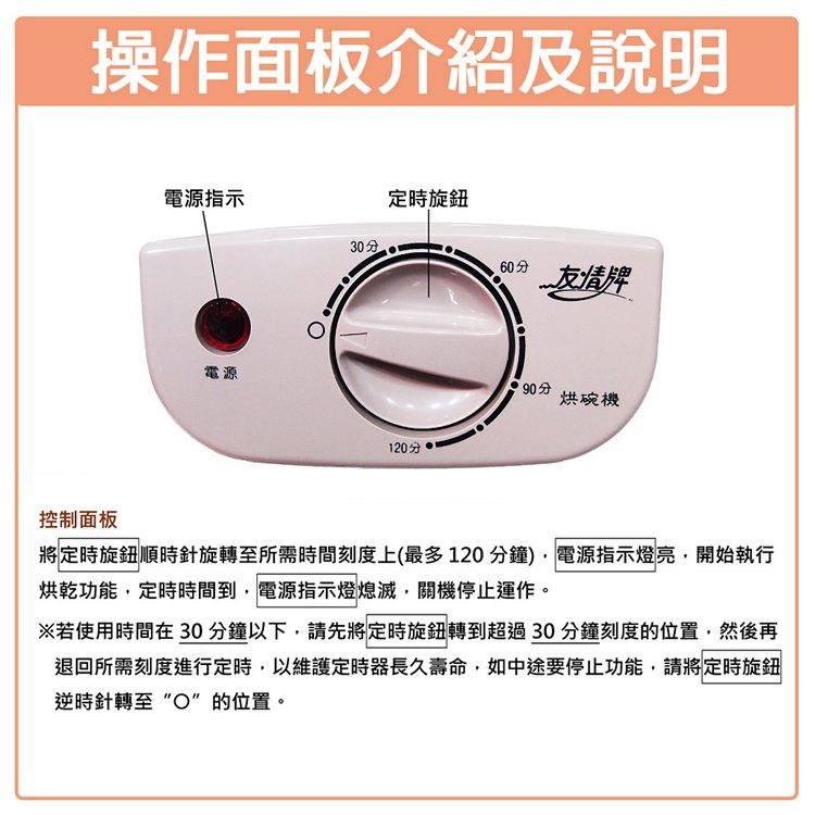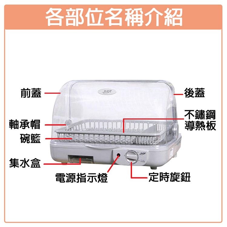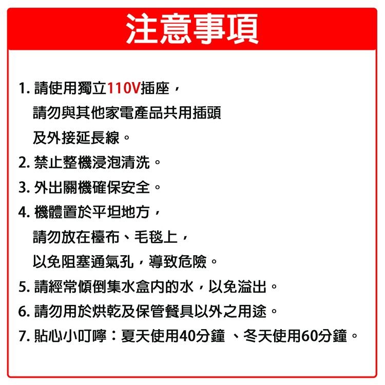 6. 請勿用於烘乾及保管餐具以外之用途。