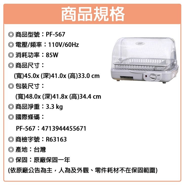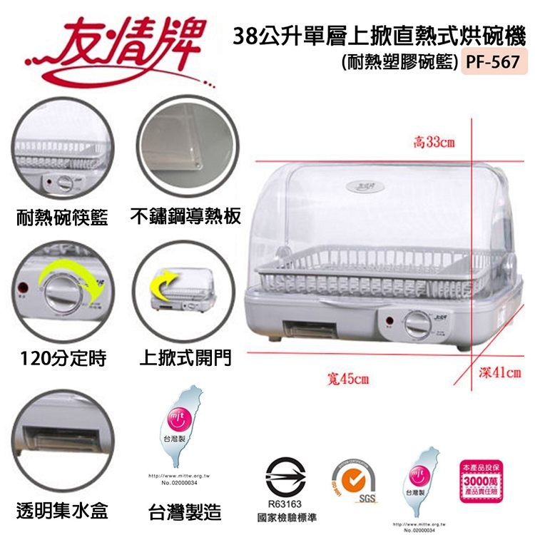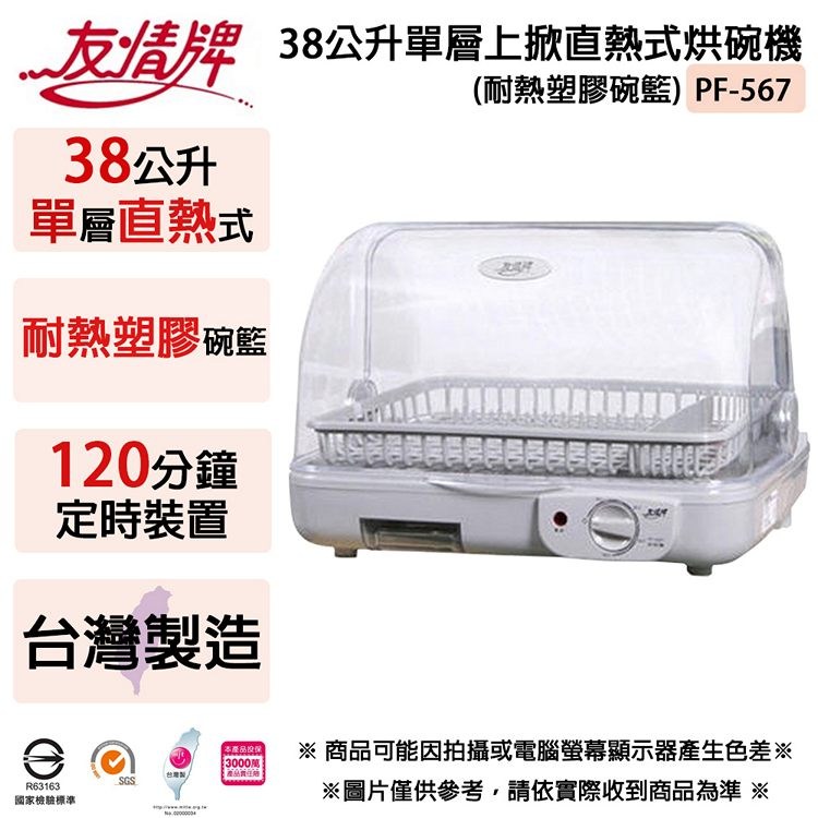 友情牌 38公升單層上掀直熱式烘碗機-耐熱塑膠碗籃 PF-567