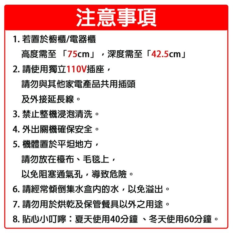 7. 請勿用於烘乾及保管餐具以外之用途。