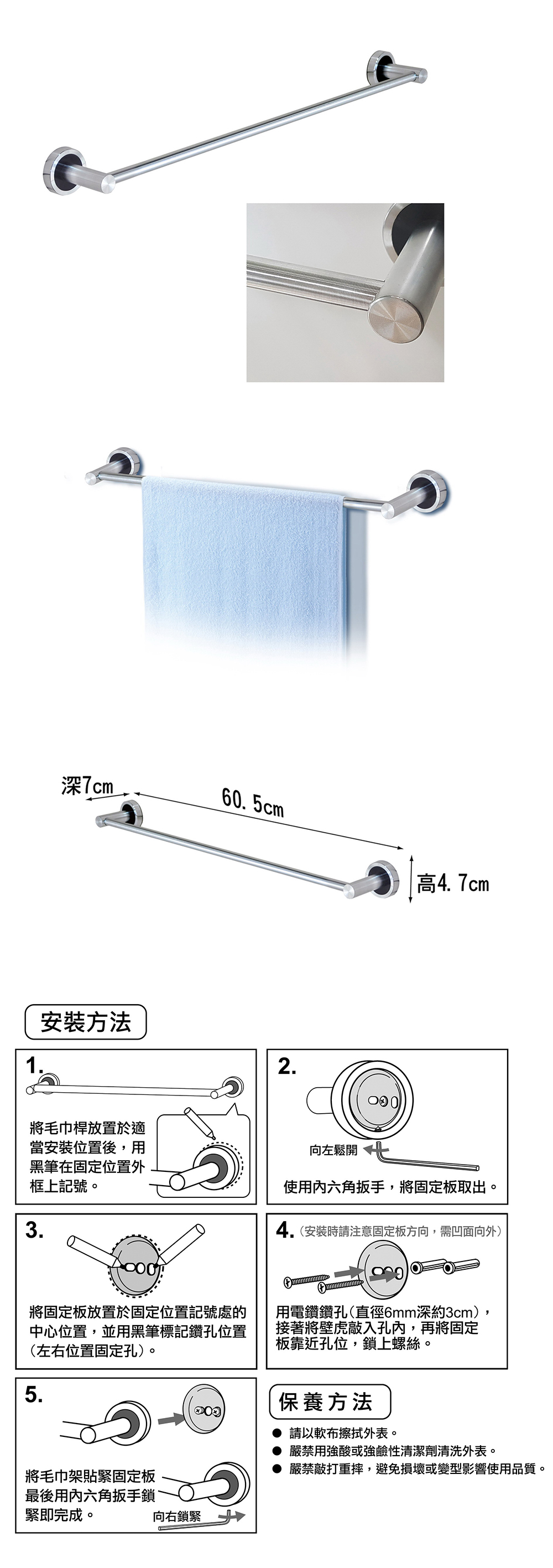 雙手萬能 皇家精品 不鏽鋼單桿毛巾架 65 x 8.5 x 5cm 拉絲 1個