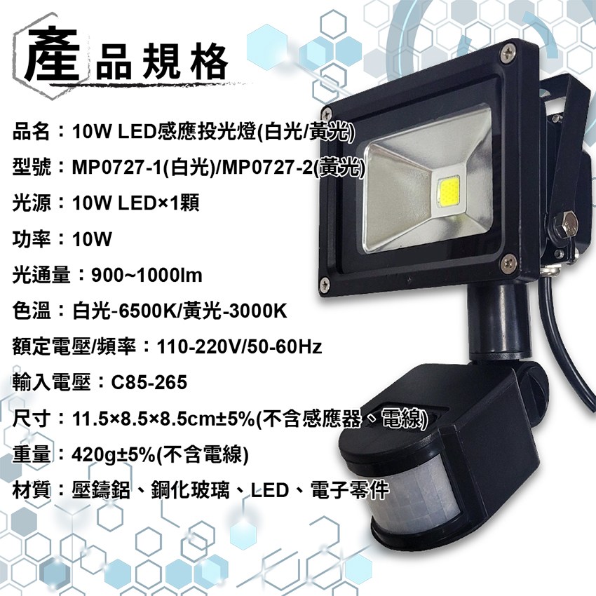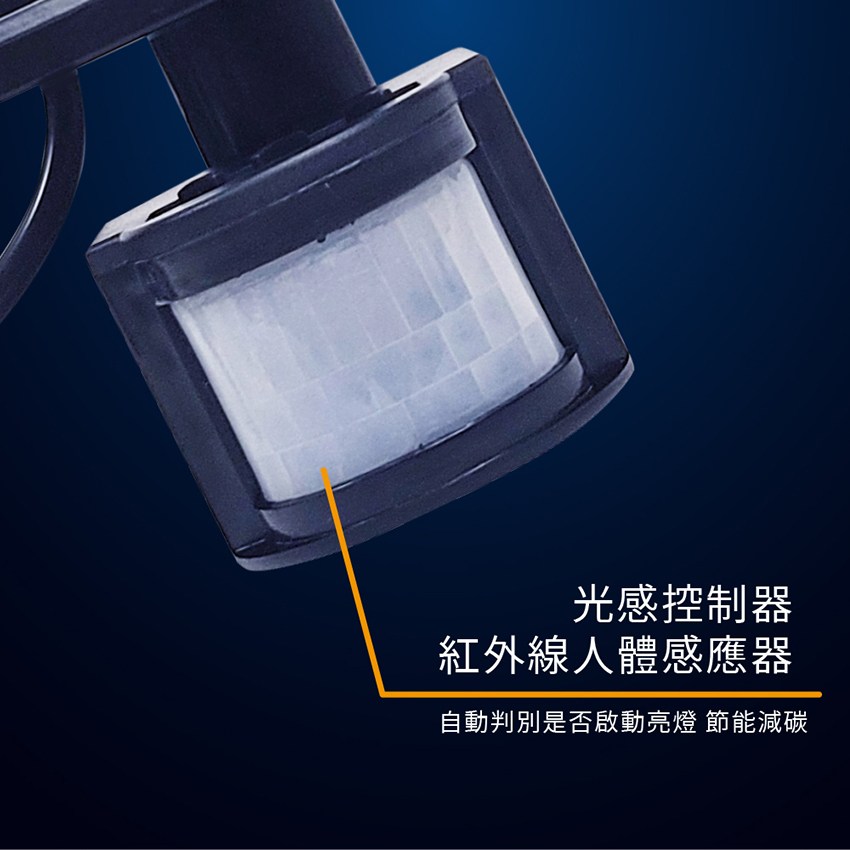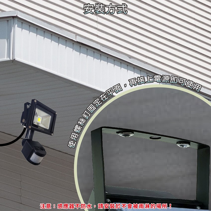 - 燈具本體防護等级為IP65,紅外線感應器並不防水,建議安裝於有遮蔽處的場所,以利延長使用壽命。