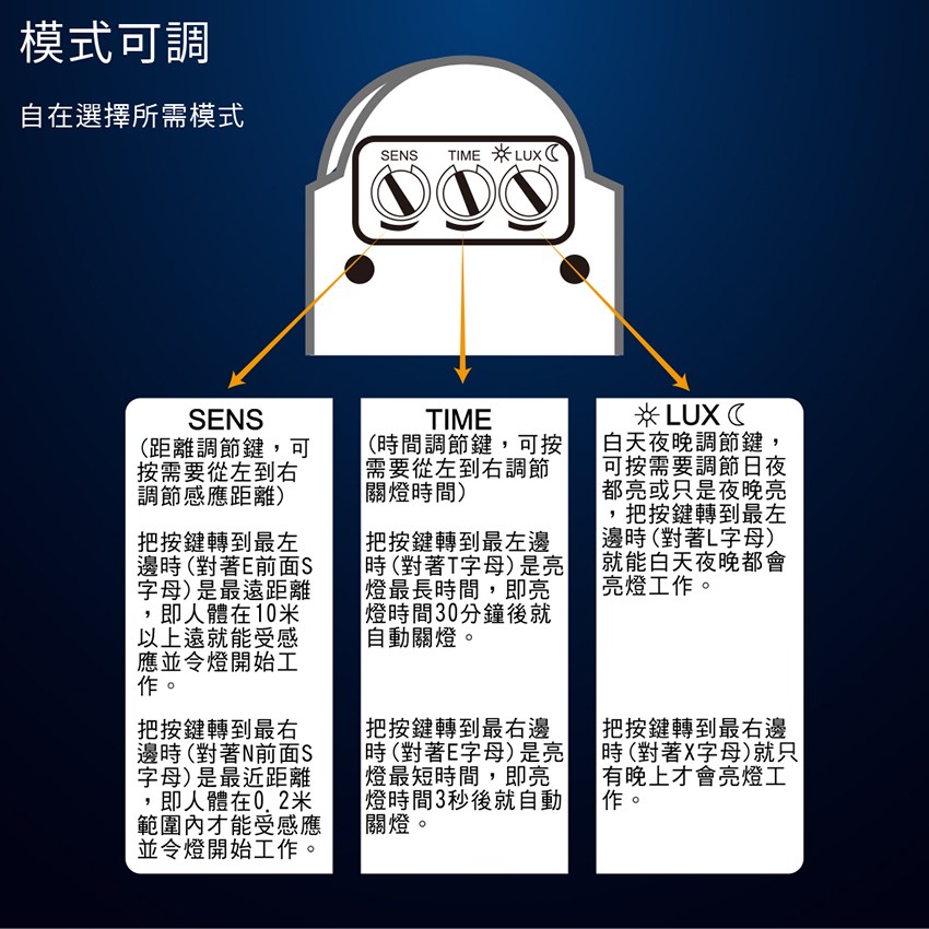 - 照射角度、感應角度、模式可隨意調整,方便使用。