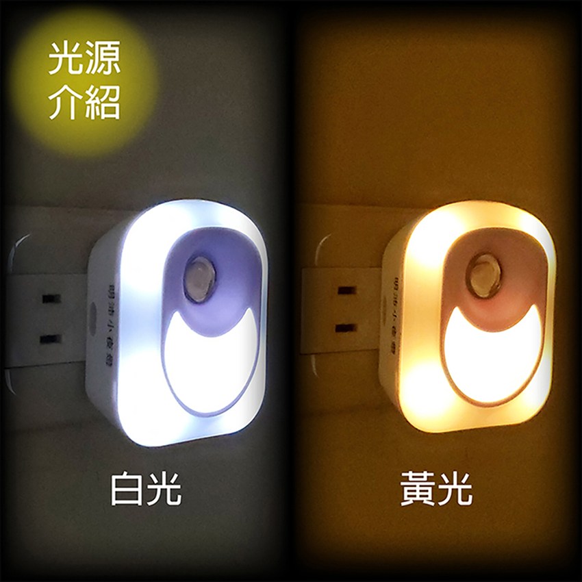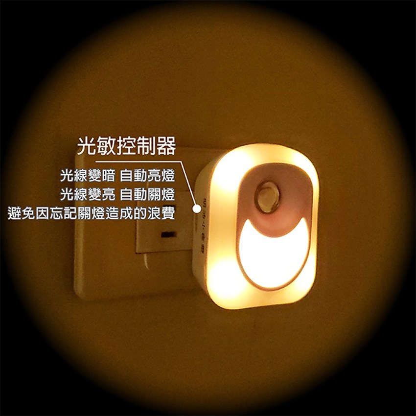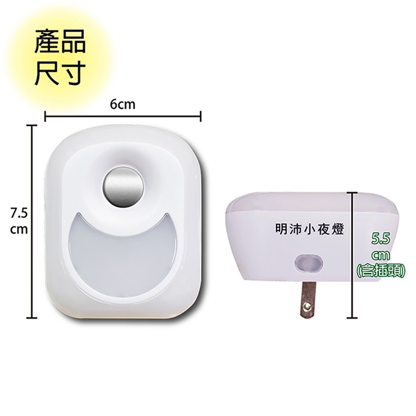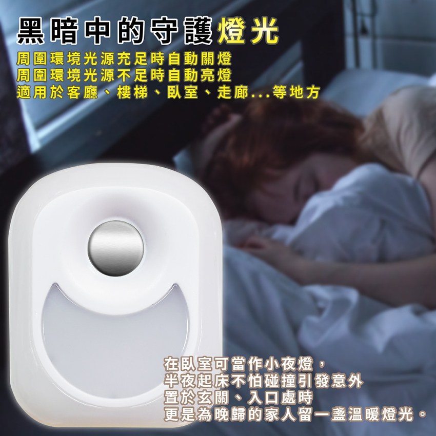 - 當光線大於7LUX時,小夜燈不啟動呈待機狀態,光線變暗時,小夜燈自動亮燈。