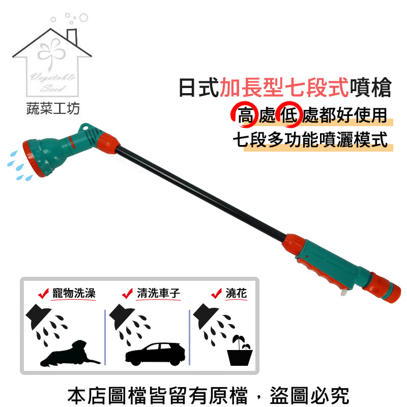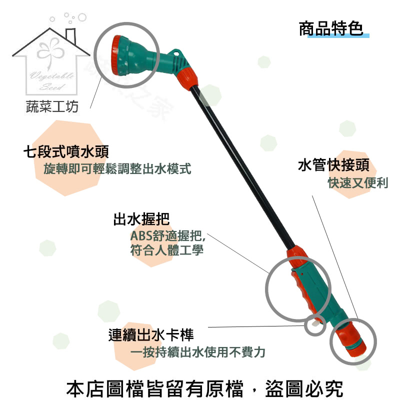 澆水頭:七段式噴水頭,旋轉即可輕鬆調整出水模式