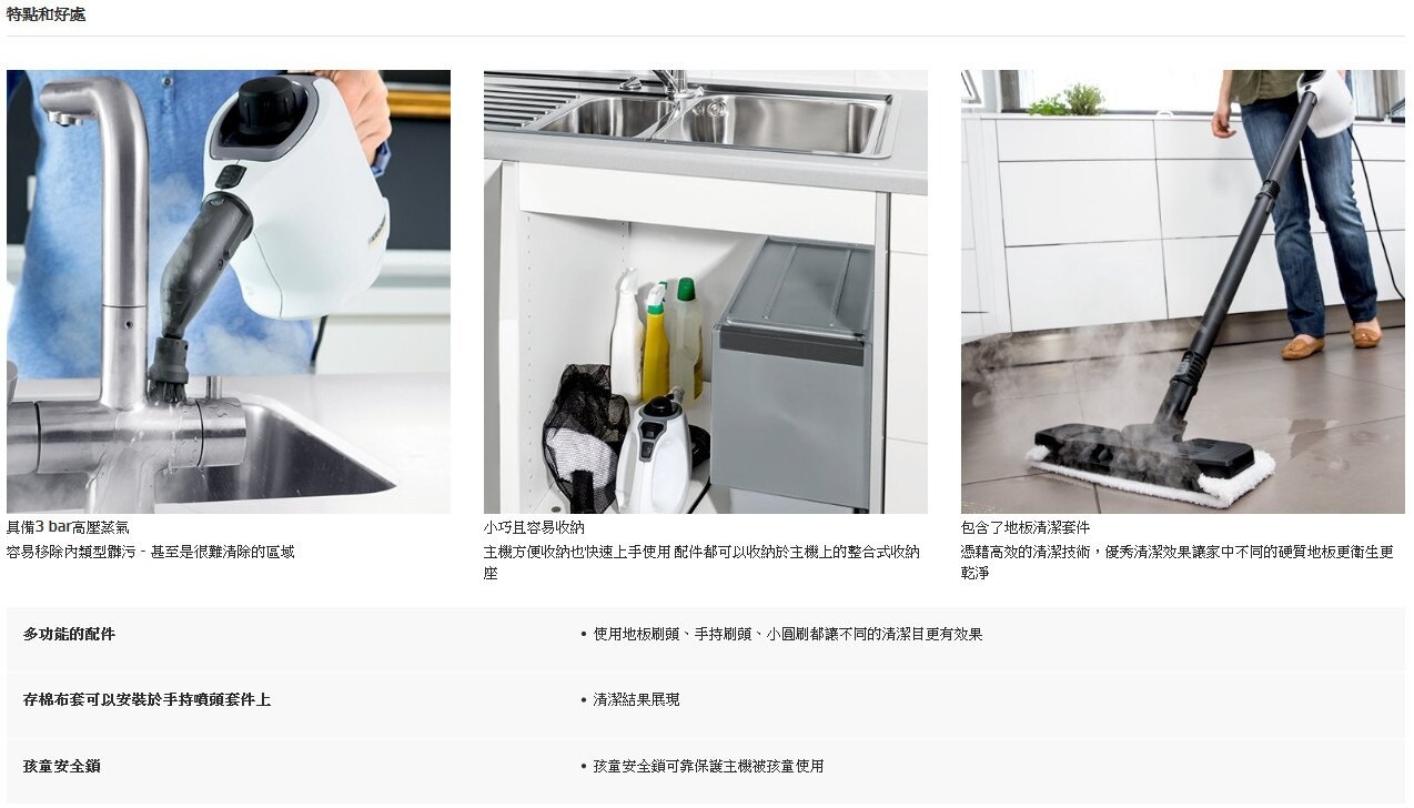 SC 1手持高壓蒸氣清洗機,內附對應各種清潔區域的蒸氣噴頭與耗材,有緊湊的2合1蒸汽拖把配件。清潔100 %無需要化學。可清潔任何的硬質表面,如管件,瓷磚,料理台及排油煙機罩整潔明亮。包括延長軟管可以更容易地清洗難以到達的區域,如角落,縫隙和壁縫。德國凱馳蒸汽清洗器徹底清潔殺死家庭硬表面的細菌功效達99.99 % ,並去除頑固污漬,石灰殘渣和油脂沉積。提供地板清潔套件使適合手持清潔地板。這款結構緊湊,方便的設備,非常快速和容易清潔和可節省儲存空間。