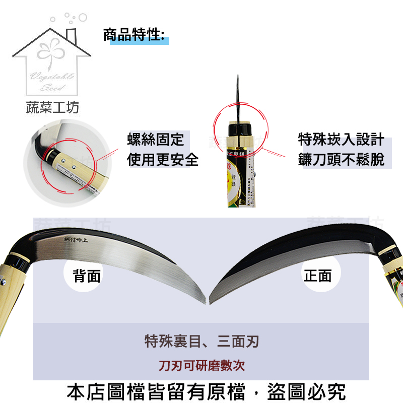 4.特殊崁入設計,鐮刀頭不鬆脫