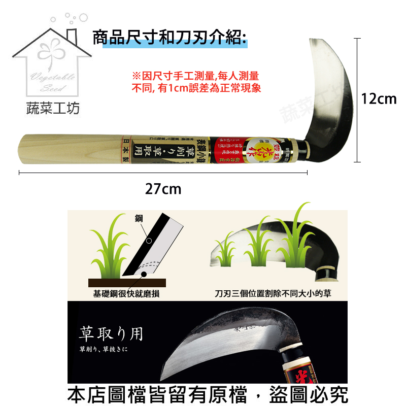 1.刀刃部特殊鋼材鍛造製成,特殊角度刀刃能輕易割斷地表上的雜草
