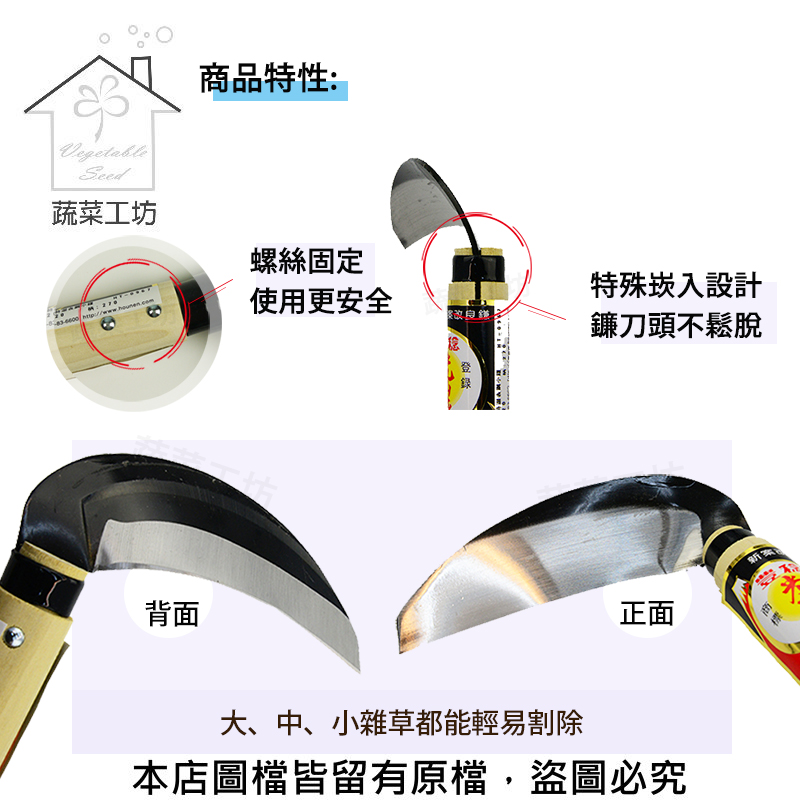 3.特殊崁入設計,鐮刀頭不鬆脫