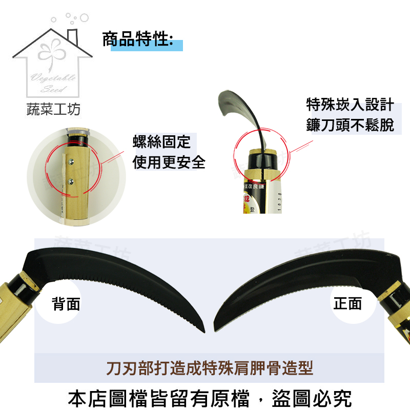3.特殊崁入設計,鐮刀頭不鬆脫