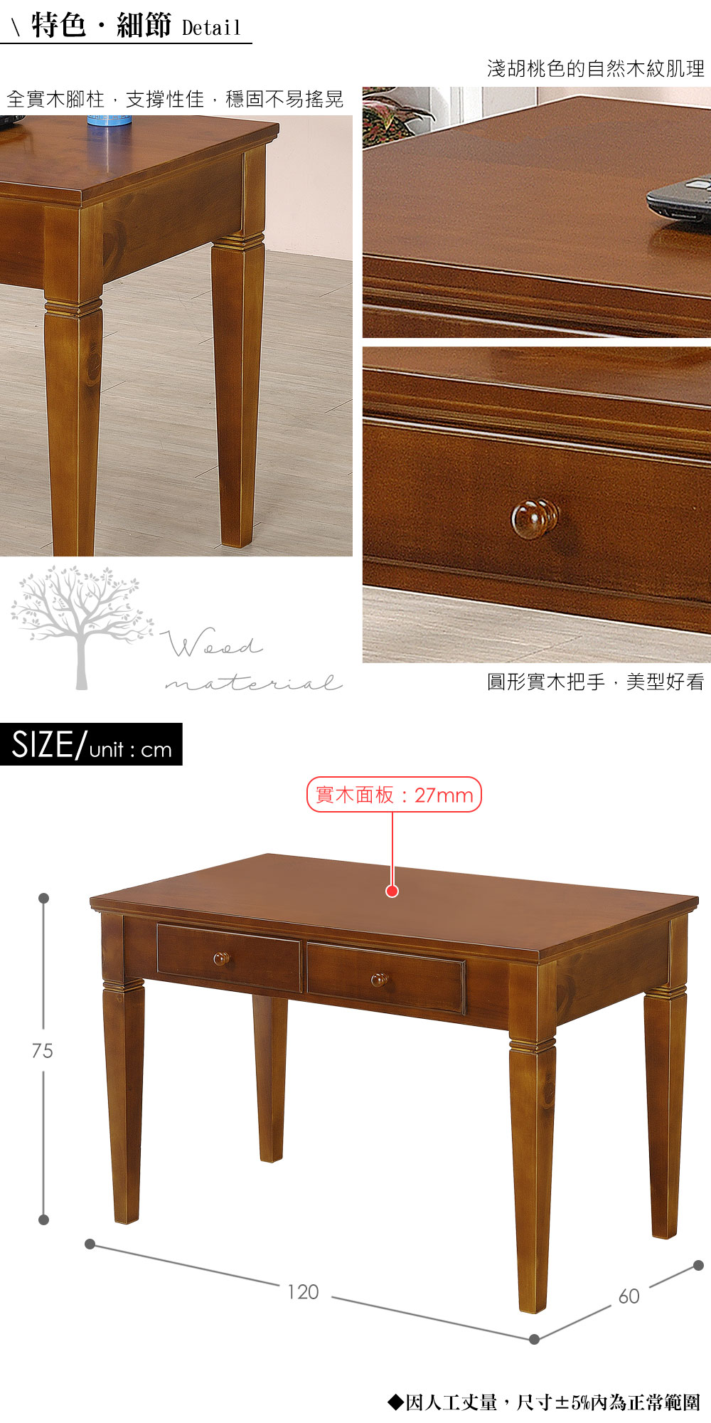 文創集 凱佳3.5尺二抽實木書桌(二色可選+含便利插座設置)-104x55x75cm免組