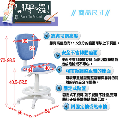 ■安全踏盤:不怕小朋友有踏不到地面的危險,學童可以輕鬆放置雙腳,讓坐姿更正確,坐起來更安穩,而且踏盤可依孩子身高調整高度,即使是年幼的孩子也不致雙腳騰空,安全又健康!