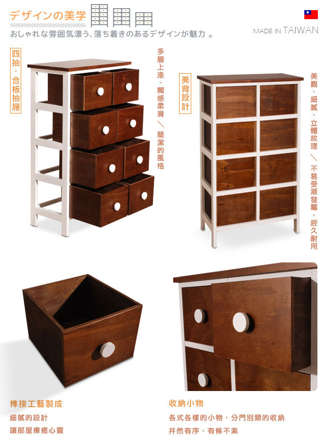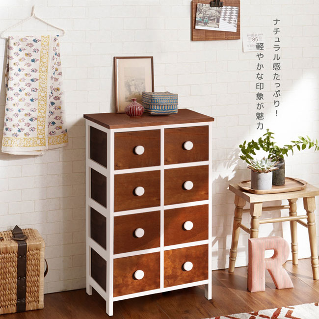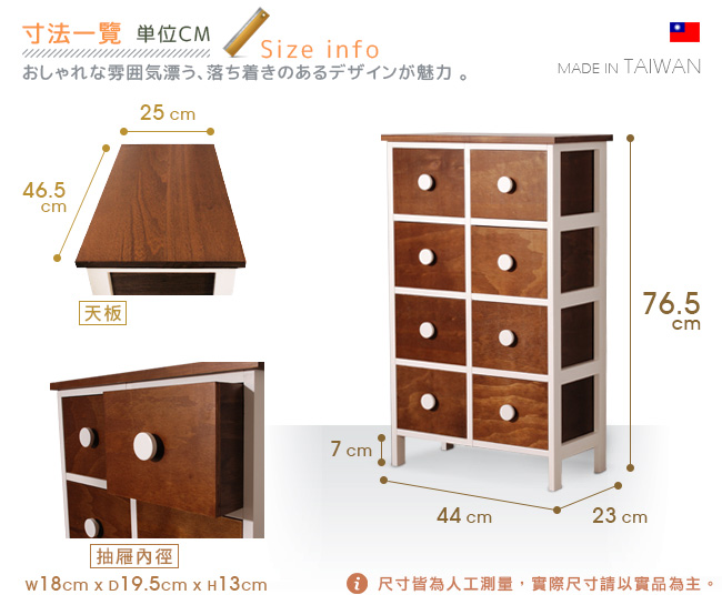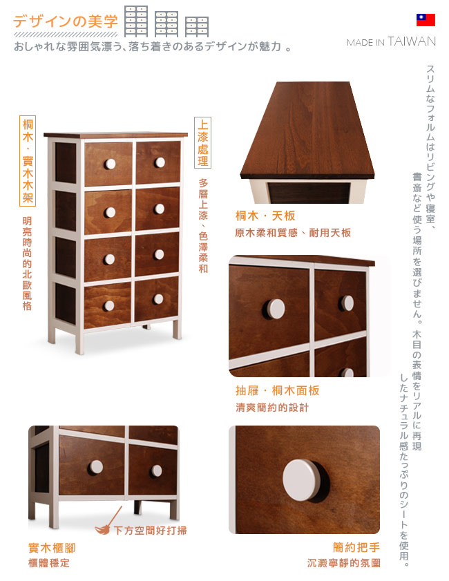 原木,獨樹一格的品味。木材表面會有木結、木紋、色差等,屬於木頭自然生成的現象。多層上漆,質感細膩,色澤柔和。桐木天板,點綴居家生活的美學。實木圓形把手,圓潤自然的曲線,賦予收納櫃感受力,讓收藏更加舒適愉快。抽屜榫接的傳統工藝,對於品質的堅持到底。雙排八抽設計,分門別類收納T-shirt、毛巾、貼身衣物、心愛小物等。櫃腳高7cm,方便清潔,保持部屋乾淨。居家擺放或店面陳設,隨意擺在角落就很有美感,融入於生活氛圍,遇見了美好。