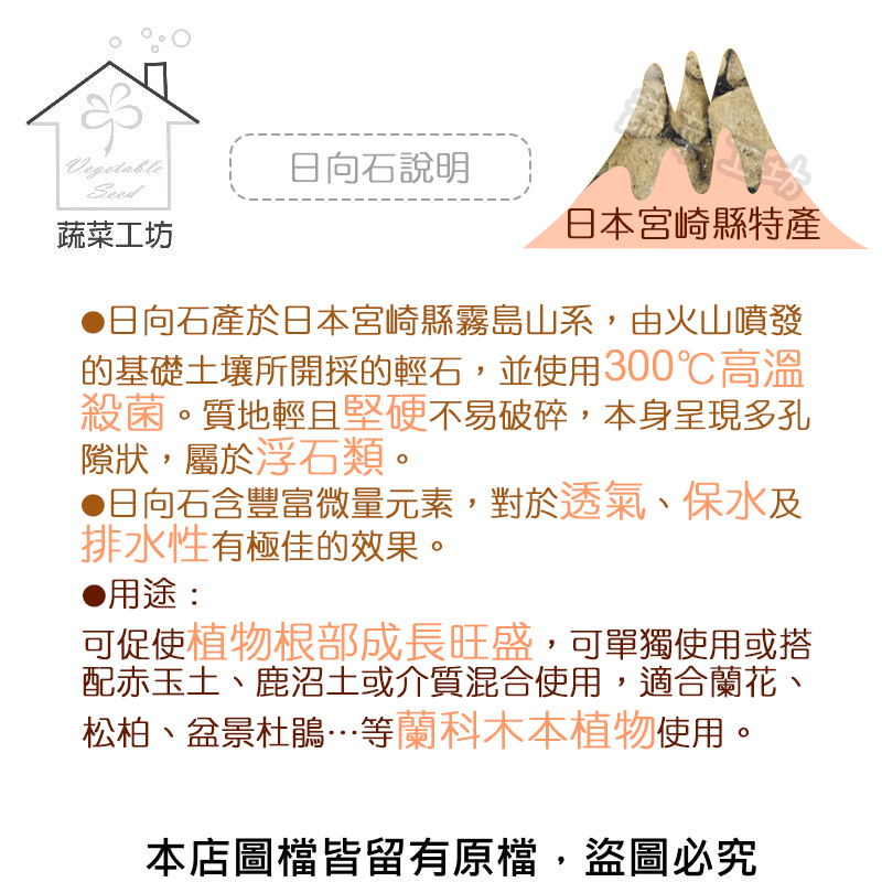 日向石產於日本宮崎縣霧島山系,由火山噴發的基礎土壤所開採的輕石,並使用300℃高溫殺菌。質地輕且堅硬不易破碎,本身呈現多孔隙狀,屬於浮石類。日向石含豐富微量元素,對於透氣、保水及排水性有極佳的效果。