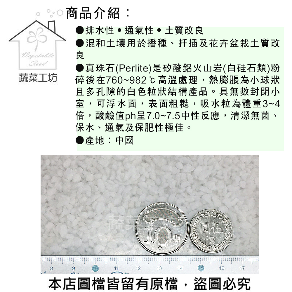 真珠石(Perlite)是矽酸鋁火山岩(白硅石類)粉碎後在760~982℃高溫處理,熱膨脹為小球狀且多孔隙的白色粒狀結構產品。具無數封閉小室,可浮水面,表面粗糙,吸水粒為體重3~4倍,酸鹼值ph呈7.0~7.5中性反應,清潔無菌、保水、通氣及保肥性極佳。