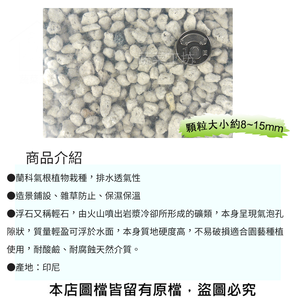 浮石又稱輕石,由火山噴出岩漿冷卻所形成的礦類,本身呈現氣泡孔隙狀,質量輕盈可浮於水面,本身質地硬度高,不易破損適合園藝種植使用,耐酸鹼、耐腐蝕天然介質。