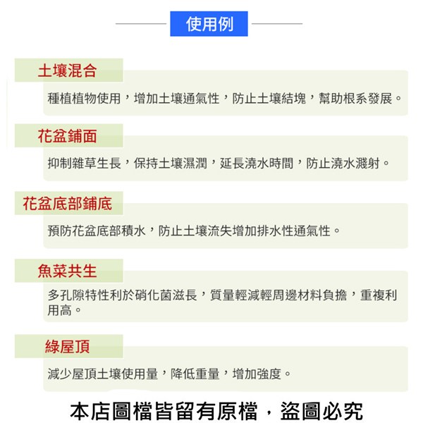 ●土壤混合:種植植物使用,增加土壤通氣性,防止土壤結塊,幫助根系發展。