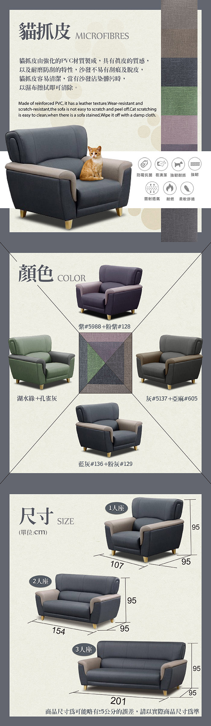 【UHO】F10-無扶手 貓抓皮三人沙發(運費另計)雙色