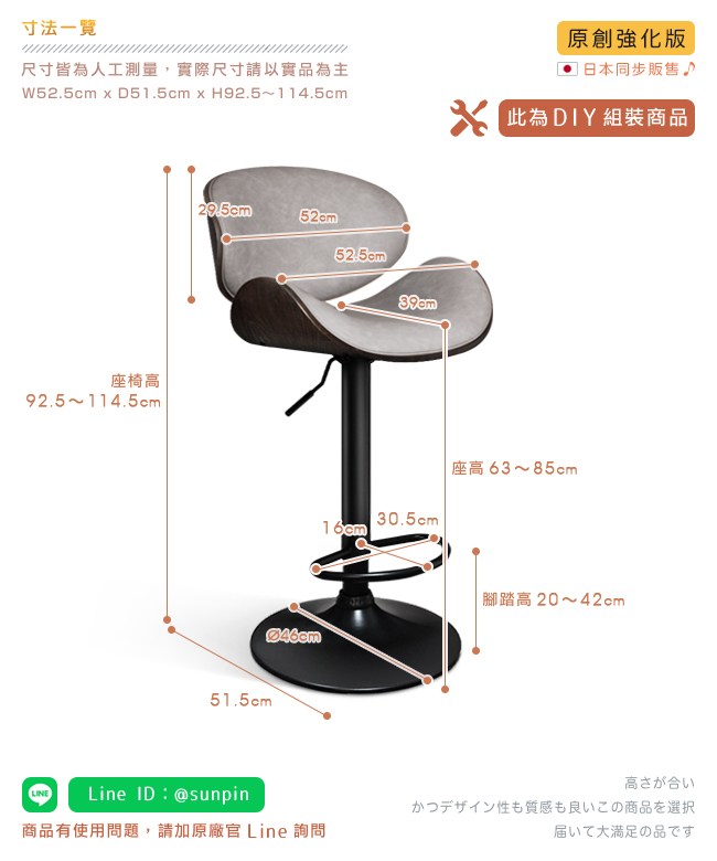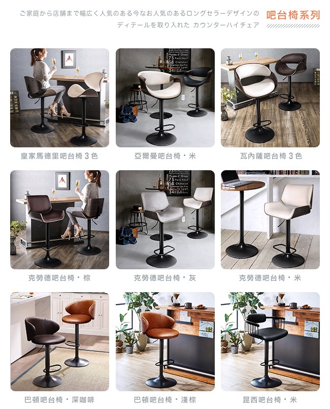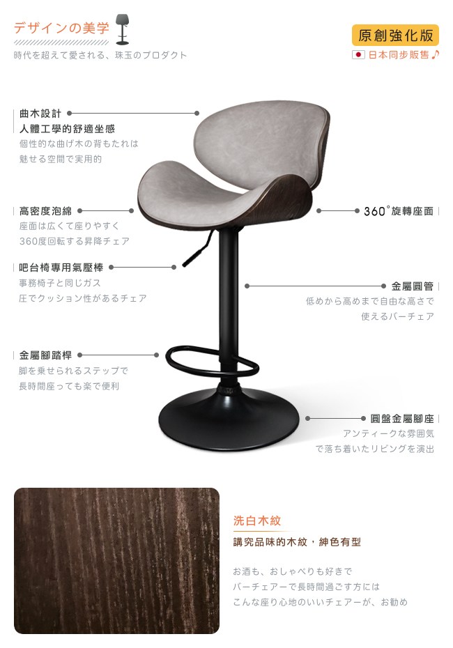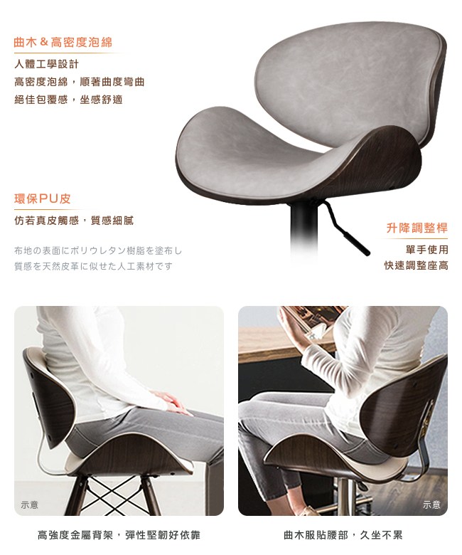 挑高的吧台椅,與眾不同的格調,提升用餐的氛圍。非常適合與廚房中島搭配,不佔空間,可以一邊料理美味食材,一邊與家人朋友談天說地,自然而然拉近彼此的距離。曲木的藝術設計與高密度泡綿,絕佳的包覆感,坐感舒適,久坐不累。環保 PU 皮,仿若真皮觸感,質感細膩。霧面消光,金屬圓管腳座,品味非凡,且抗氧化不易生鏽,經久耐用。隨個人喜好與身高,吧台椅可調高度 22cm,金屬腳踏桿方便雙腳踩踏。底座軟質止滑墊增加抓地力,更加安全牢固,且可避免刮花地板。