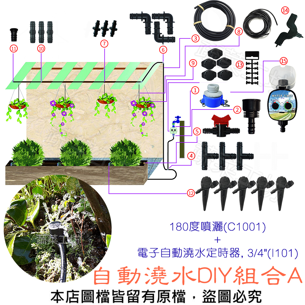 自動澆水DIY組合A (180度噴灑(C1001)+電子自動澆水定時器, 3/4"(I101))