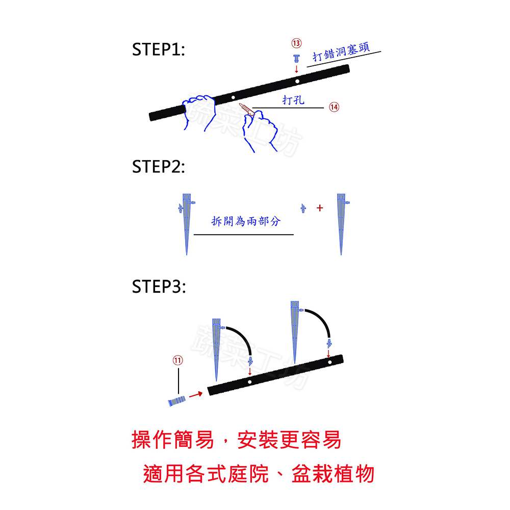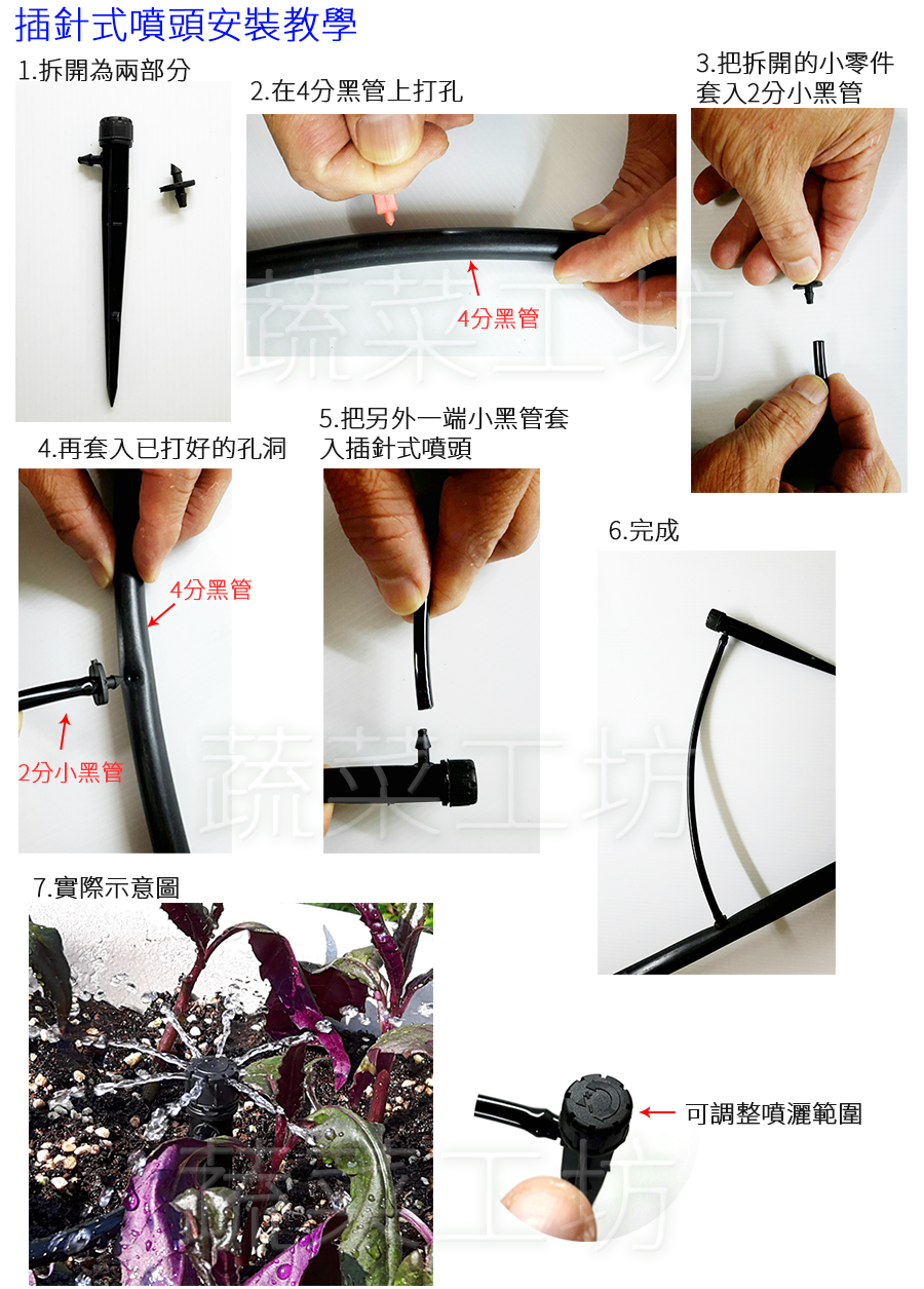 ★冬天溫度低小黑管較硬不好裝配,可先使用滴架尾部尖端先套入小黑管擴孔,再行套入滴架,此材質管徑較厚,較為耐壓且防曬耐用。