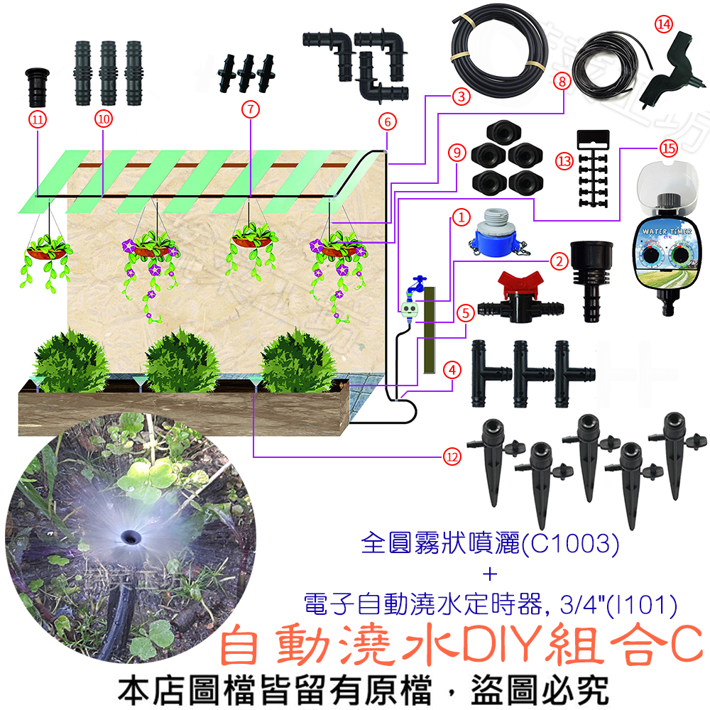 自動澆水DIY組合C (全圓霧狀噴灑(C1002)+電子自動澆水定時器, 3/4"(I101))