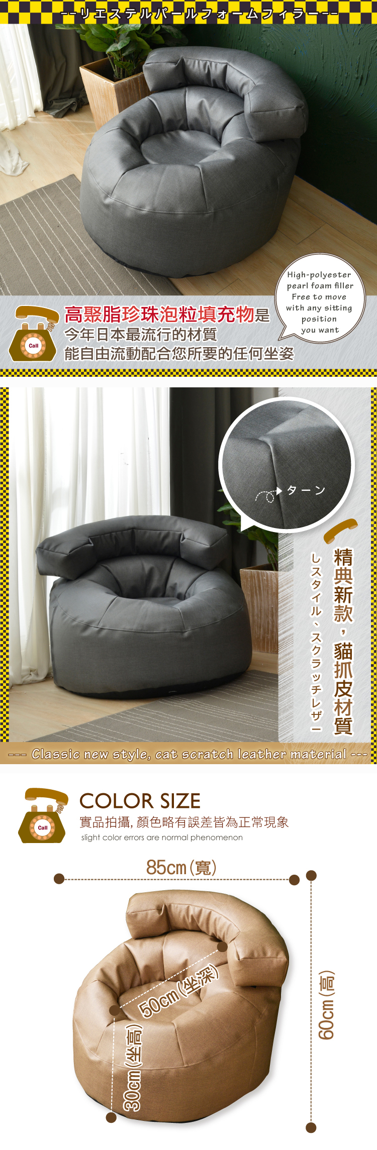 ‧高聚脂珍珠泡粒填充物是今年日本最流行的材質,能自由流動配合您所要的任何坐姿。