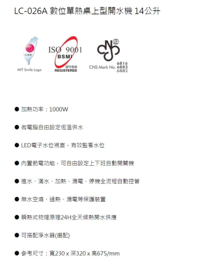 龍泉 LC-026A 數位單熱桌上型開水機 14公升 含基本安裝
