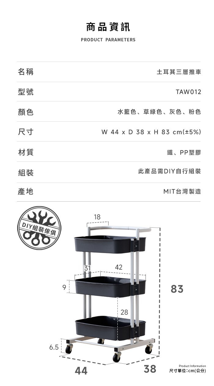 康得倫KTL 輕巧型三層塑膠柱工作車 粉藍/粉紅 /台 KT-128Q7/KT-128Q8【APP滿額下單10%點數(單一帳號最高5000點)】1/31止