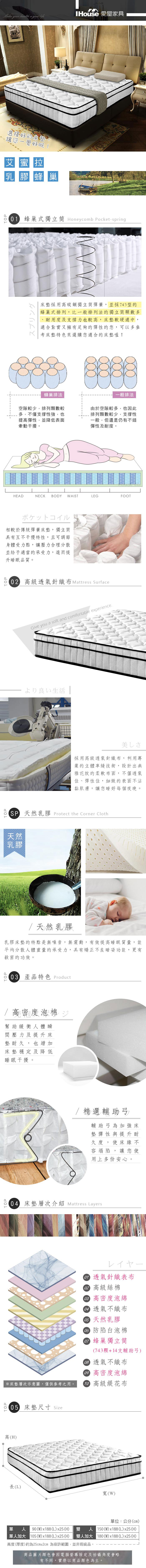 obis Julia三線3M防潑水蜂巢式乳膠獨立筒床墊雙人加大6尺