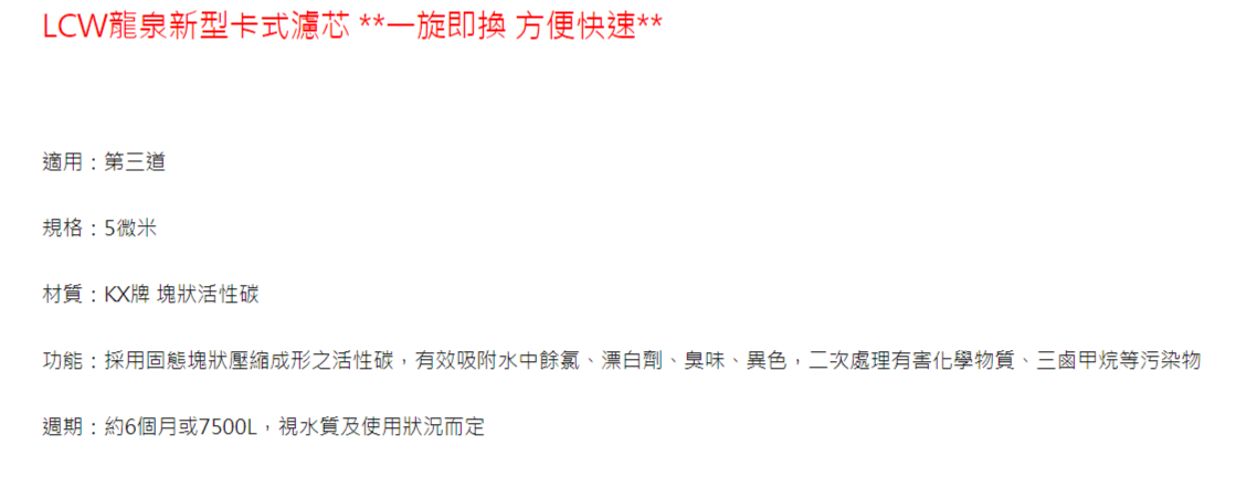 龍泉 活性碳濾芯 LC-R-831 氣泡水飲水機專用濾芯 (適用機型:LC-8871/LC-8872/LC-8571/LC-8572
