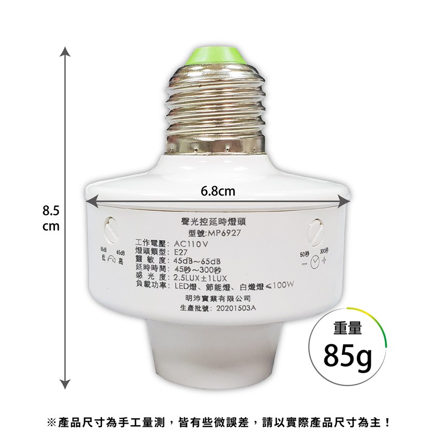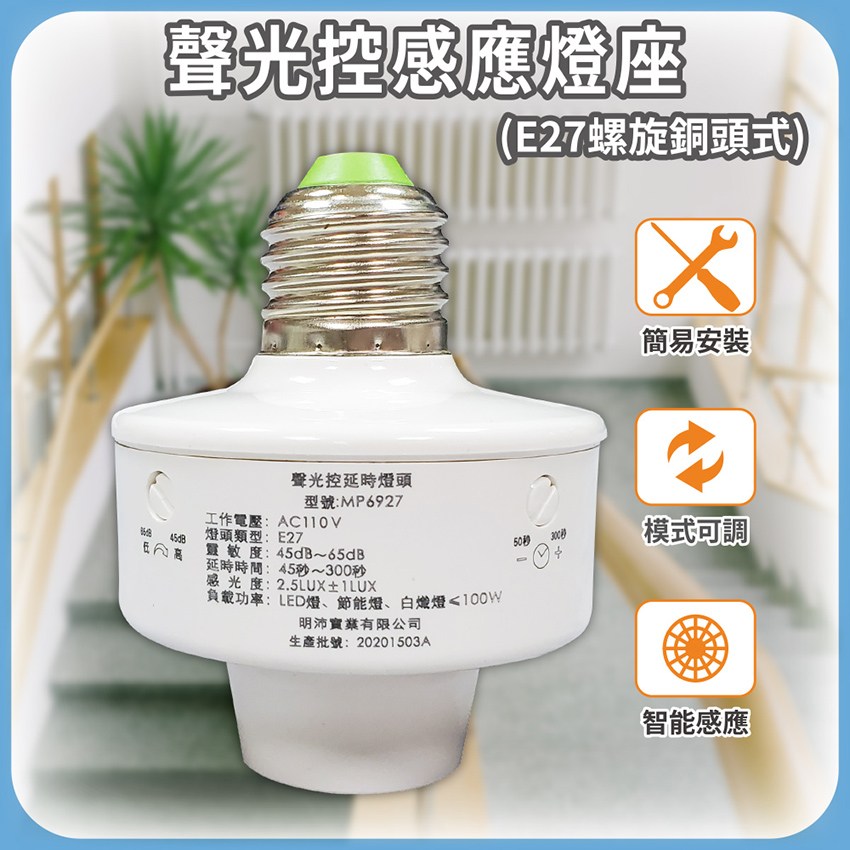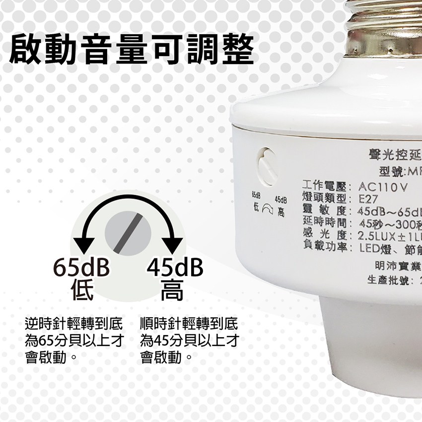 - 附有聲控調節鈕,接收聲音強弱啟動控制,可調整。