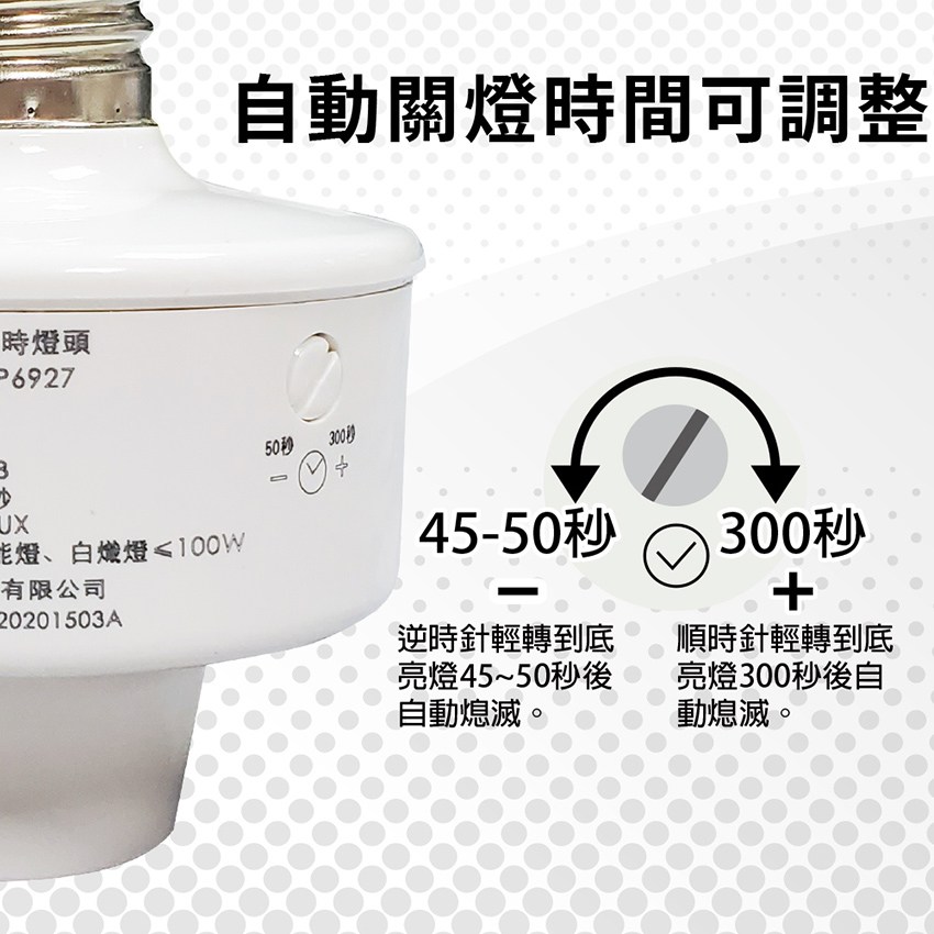 - 亮燈時間調節鈕,延遲通電亮燈時間可調整。