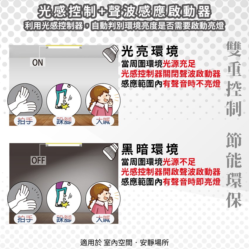- 在晚上貨光線比較暗時拍手、跺腳、喊…的聲音都可以觸發開燈,並沒有死角。