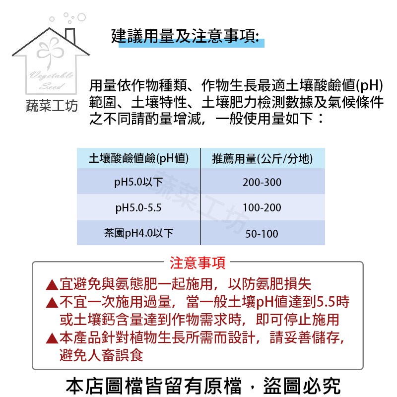 用量依作物種類、作物生長最適土壤酸鹼值(pH)範圍、土壤特性、土壤肥力檢測數據及氣候條件之不同請酌量增減,一般使用量如下: