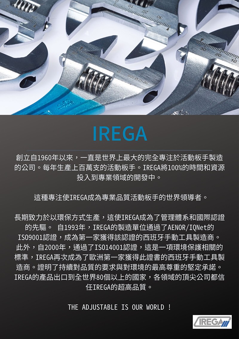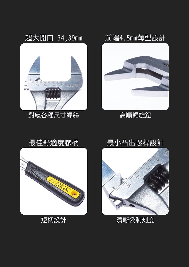 IREGA SWO 92膠柄活動板手 6吋 加強鉻釩鋼 短型握把 超大開口 附公制刻度 1個