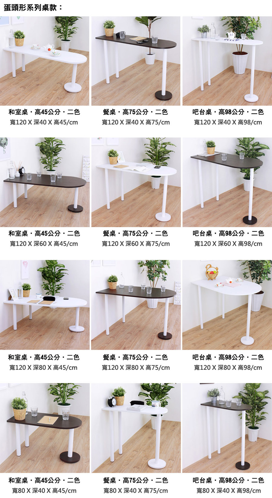 ◆蛋頭形桌面,深度60公分,寬度120公分,高度75公分。