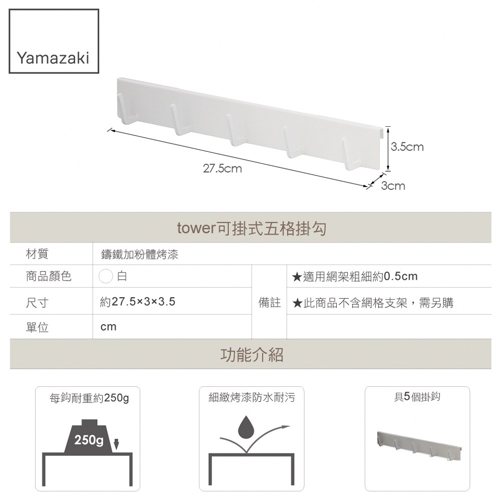 本商品僅含五格掛勾,需搭配賣場另售商品-" tower網格收納支架 "