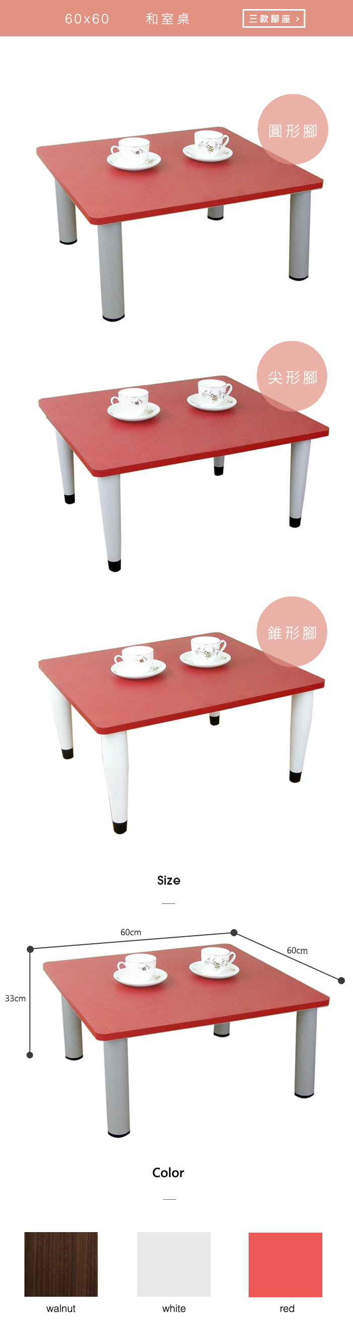◆商品品名:寬60公分x深60公分[戶內外]休閒桌/和室桌/餐桌(三款腳座可選)