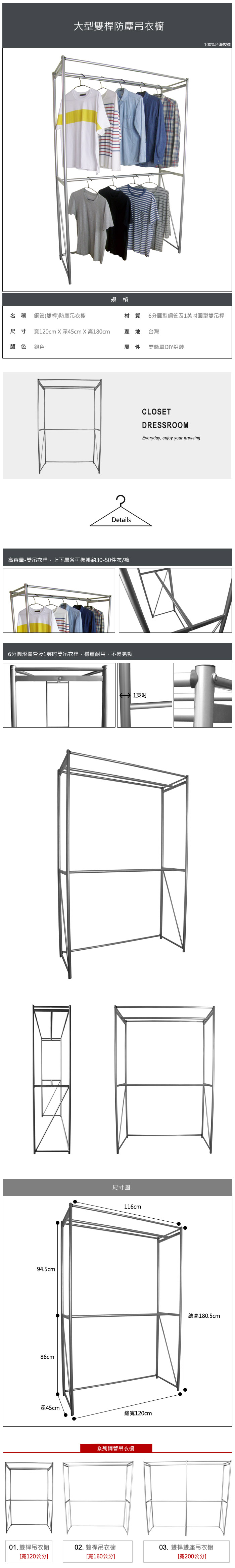 ◆[120公分寬]大型(圓型雙吊桿)吊衣架/衣櫥,高容量縱深度夠,衣褲不用側掛。