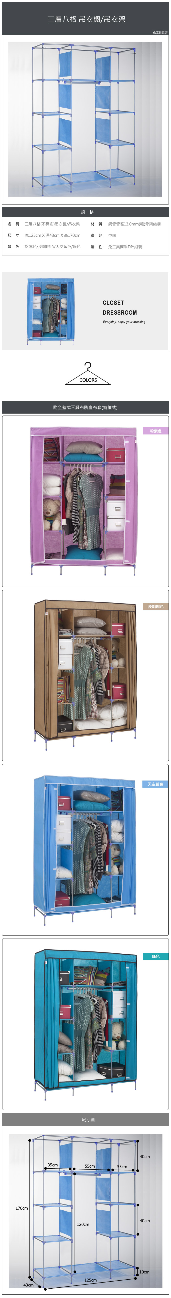 【頂堅】125公分[寬]-三層八格(不織布)吊衣架/吊衣櫥(附彩色布套)-4色可選