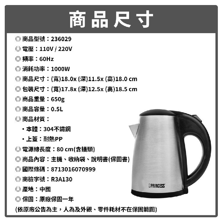 PRINCESS荷蘭公主 0.5L雙電壓旅用快煮壺 236029