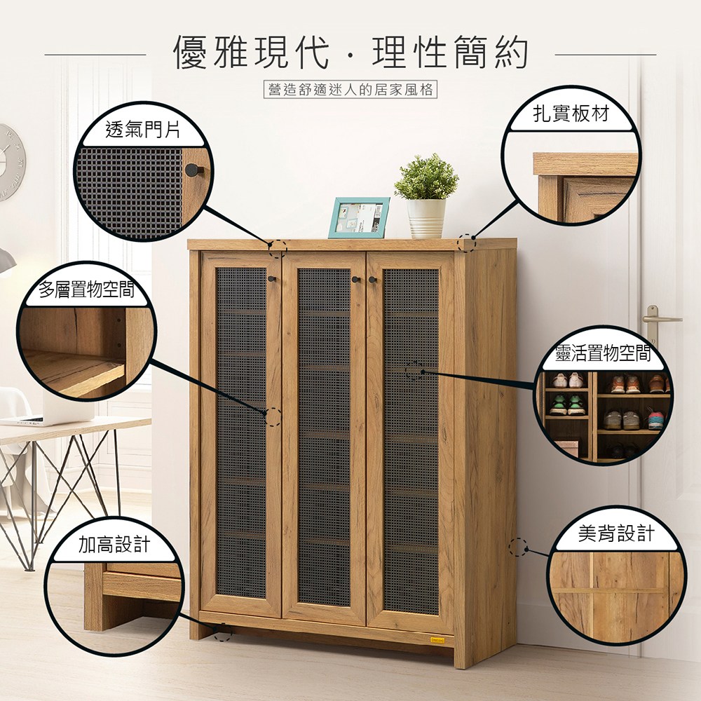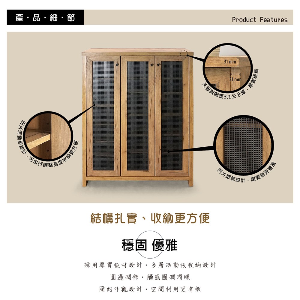 厚實的3.1公分板件(天板與側板及底板),有別於其他市售1.5公分厚板件鞋櫃,穩固不搖晃,堅實耐用。